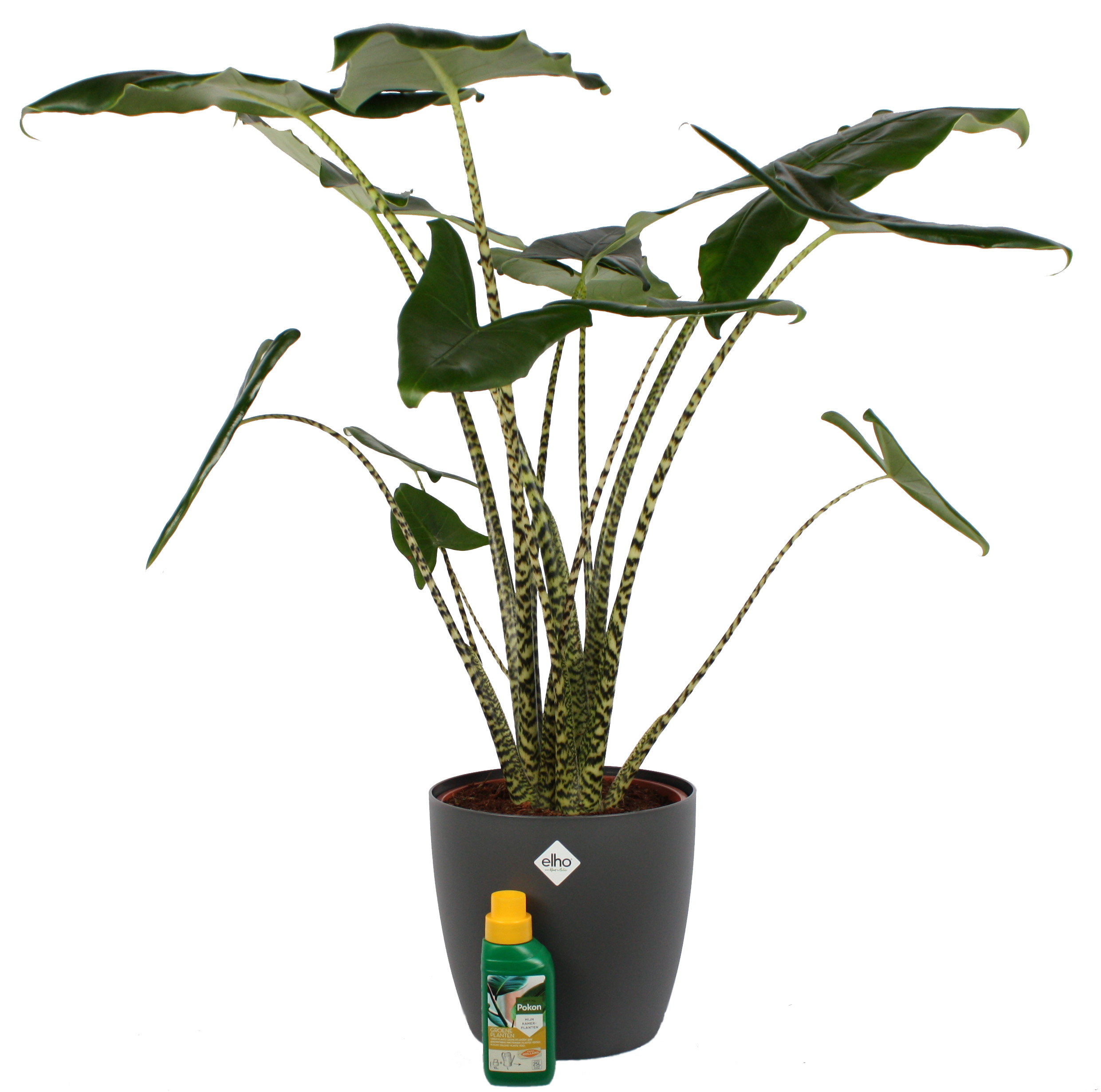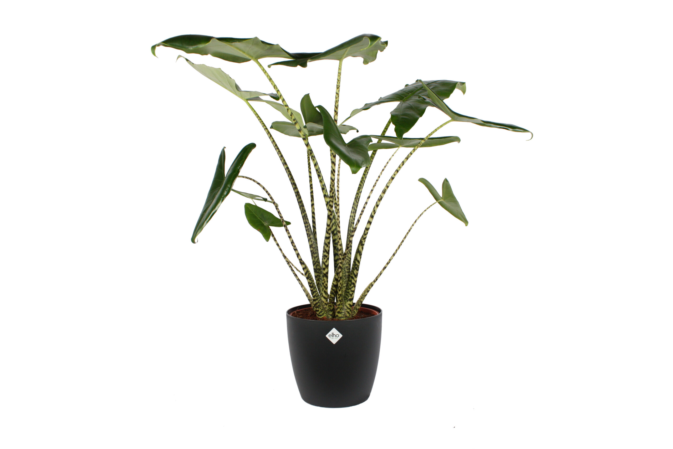 Met zijn gestreepte stelen en scherpe lijnen in het blad is deze leuke Alocasia een opvallende verschijning.
